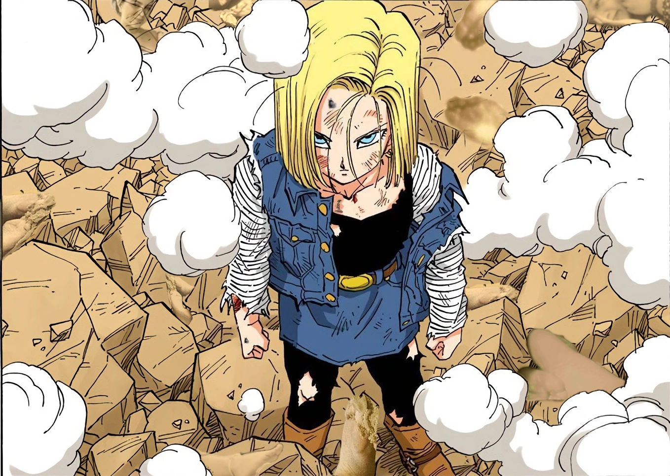 Pendant qu'elle enlève sa veste déchirée, C-18 déclare qu'elle n'en revient pas du niveau de puissance de son adversaire, en lui révélant qu'elle ne s'attendait pas à ce que le Prince Sayain puisse la pousser aussi loin dans ses retranchements. En laissant sa veste s'écraser au sol, la jeune femme robot demande alors au Sayain si ce fameux Son Goku dont elle entend tant parler est plus fort que lui. Végéta répond alors que même si Goku l'a dépassé à un moment, tout est redevenu comme avant et il a pris le dessus sur lui. C-18 sourit alors en recoiffant ses cheveux qu'elle est déçue, car finalement aucun des deux sayains ne saura la satisfaire en termes de combat, jugeant les deux Sayains aussi nuls l'un que l'autre.