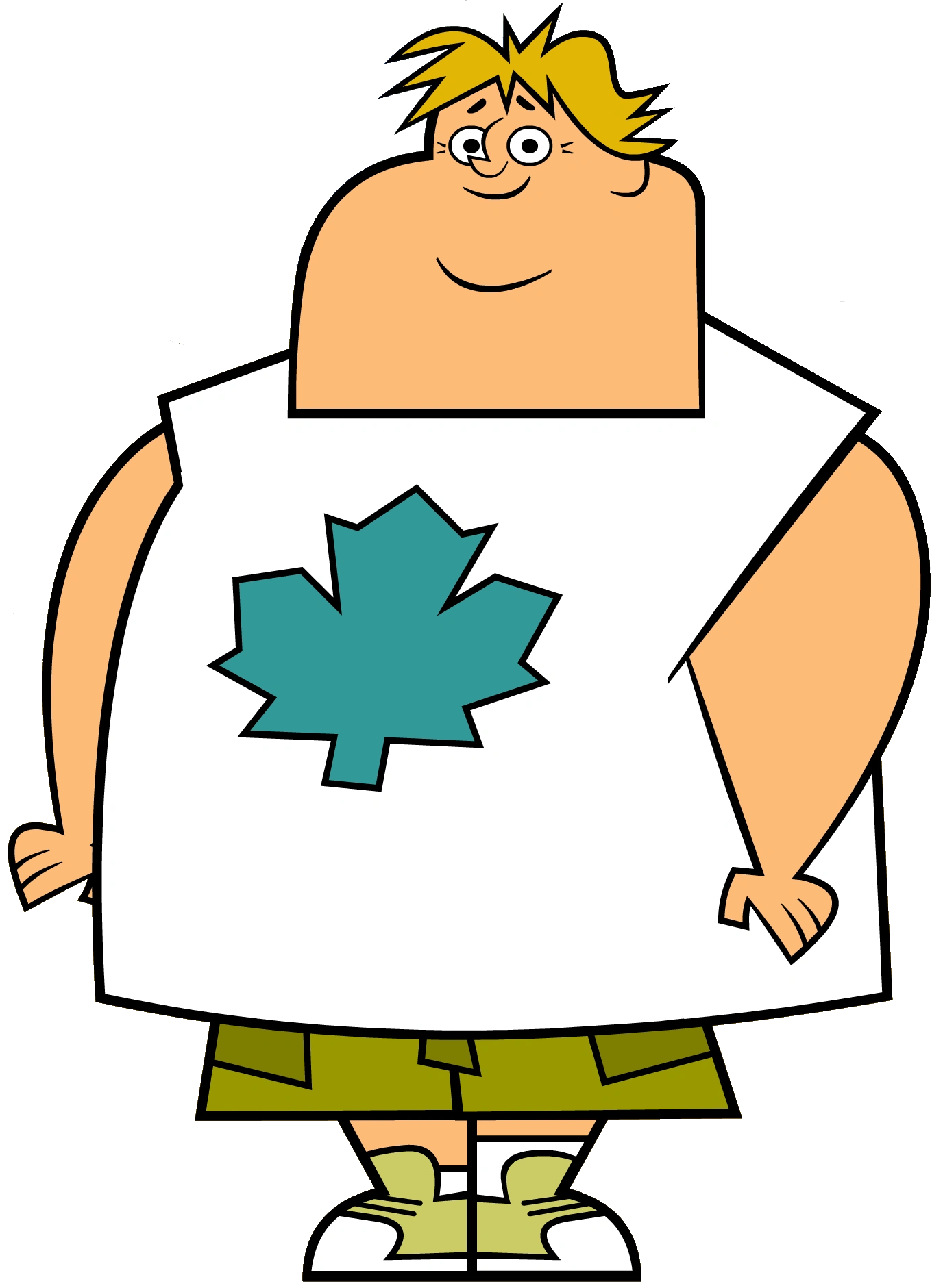 Gontran est un adolescent obèse aux cheveux blonds, aux yeux verts et à la peau claire. Il porte un tee-shirt blanc avec une feuille d'érable dessiné en bleu au centre, un short vert, des chaussettes blanches (avec une qui est plus grande que l'autre), et des chaussures vertes/blanches.