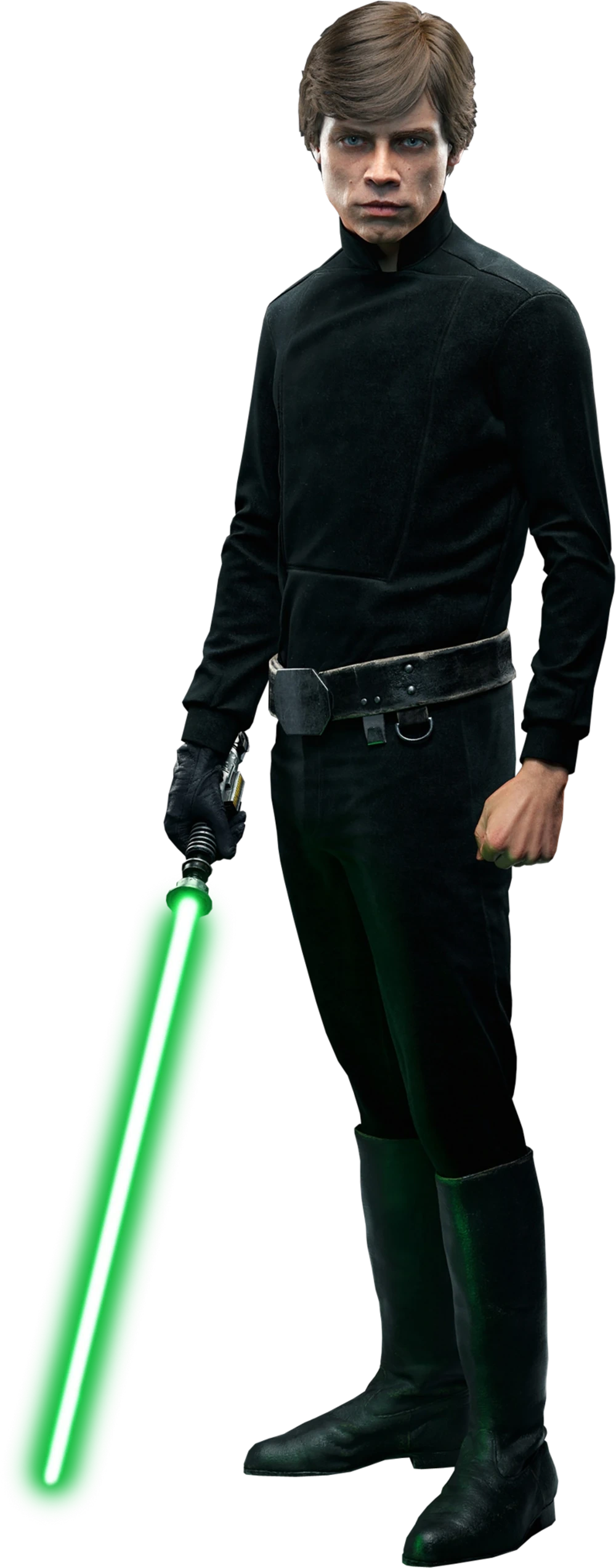 - Combat au sabre-laser: Bien qu'il ait reçu peu de formation, Luke Skywalker est rapidement devenu très compétent dans le combat au sabre laser. L'entraînement initial de Luke avec l'arme du Jedi a été une brève session avec Obi-Wan Kenobi et un entraînement à distance sur le chemin d'Aldérande, où il a appris la position initiale et les quatre postures de défense. Bien que son niveau se soit révélé insuffisant lors de son premier mais bref duel contre Dark Vador sur la Lune 1, ses compétences au combat s'étaient améliorées pour leur duel sur Bespin, et ont culminé avec sa victoire sur le Seigneur Sith au combat lors de la bataille d'Endor. Skywalker avait quelques compétences en Formule V, capable d'intercepter les tirs de blasters. Lors de sa mission à Rodia, il s'est essayé pour la première fois au Jar'Kai avec son sabre laser et celui de Huulik. Bien qu'il ait tué un fantôme, il a admis que ce n'était pas une question d'habileté, mais de "réflexes paniqués et de très bonnes armes". Il a reçu une formation complémentaire du "Gamemaster", un serviteur de Grakkus le Hutt, qui avait appris l'art du combat au sabre laser. Forcé de le combattre, lui et les MagnaGuards du Hutt, Skywalker a amélioré ses capacités de combat superficiel. Après un bref temps d'entraînement avec Yoda, Luke s'est révélé être un duelliste doué sur Bespin. Skywalker engagea Vader dans un duel féroce et parvint même à tenir bon pendant une grande partie du duel et même à blesser Vader à l'épaule, impressionnant le Seigneur des Ténèbres par son habileté, bien que Vader ait finalement battu son fils et lui ait coupé la main, prouvant ainsi sa supériorité. Plus tard, Skywalker montra ses capacités au combat lors du sauvetage de Han Solo, où une escarmouche s'ensuivit au cours de laquelle les Jedi tuèrent de nombreux gardes à bord du skiff d'exécution et de la barge à voile de Jabba. Plus tard, à bord de la seconde étoile de la mort, Luke a montré ses capacités améliorées et a finalement pu affronter Vader sur un pied d'égalité. Cependant, sa réticence à combattre son propre père le retint en partie ; mais lorsque Vader menaça de faire basculer Leia du côté obscur, un Luc enragé déchaîna toute sa capacité brute, accablant et vainquant le Seigneur Sith. Contrairement à son père dans le duel final contre Dark Tyranus, Luc n'utilisa que peu ou pas de finesse ou de stratégie. Plus tard dans sa vie, Luke a montré des capacités encore plus grandes dans le combat au sabre laser. Il a enseigné l'art du combat au sabre laser à de nombreux étudiants, dont son neveu Ben Solo, qui deviendra plus tard son meilleur élève et détruira son Ordre Jedi. Luke a vaincu sans effort les Chevaliers de Ren, esquivant leurs attaques et détruisant leurs armes, en combat rapproché avant d'utiliser la Force pour les désarmer. En combattant une Rey en colère à l'aide de son bâton de quartier, Luke, à l'aide d'une tige de métal, a facilement bloqué chacun de ses coups après avoir esquivé avec fluidité son assaut initial et l'avoir touché une fois avant de la désarmer rapidement. Plus tard, sur Crait, sa projection a réussi à éviter facilement chacune des attaques de Kylo Ren sans avoir besoin d'utiliser son sabre laser pour bloquer, retenant cette dernière sur la planète Crait assez longtemps pour que les membres restants de la Résistance puissent s'échapper.