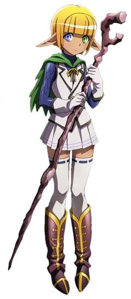 En termes de vêtements, il porte une armure de cuir légère en écailles de dragon bleu indigo, recouverte d'un gilet blanc au bordure noires. Ce dernier porte le sceau de la guilde d'Ainz Ooal Gown brodé sur le côté gauche et à ses épaules flotte une petite cape dont la couleur vert foncé évoque des feuilles d'arbres. Au-dessous, il porte une jupe courte blanche assortie à son gilet avec une paire de collants blancs et des bottes en cuir marron aux bordures et aux laçages dorés. Ses mains fines sont revêtues de gants de soie blancs et il manient un bâton tordu en bois noir. Il a également autour du cou une chaine d'argent sertie d'un médaillon argenté en forme de gland, très similaire à celui de sa sœur.