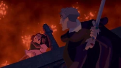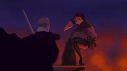 Dans la bataille qui s'ensuit pour la cathédrale, Quasimodo réussit à empêcher les gardes de Frollo de venir nuire à Esméralda en créant un lac de métal en fusion. Malgré cela, Quasimodo croit d'abord qu'Esméralda est morte, et quand il voit le juge Frollo dans l'ombre avec un poignard, il se met sur la défensive avec lui et rejette tout ce que son ancien maître lui a enseigné sur le monde comme un endroit cruel. Esméralda se réveille alors et Quasi la protège ainsi que lui-même de Frollo, qui tente de les tuer tous les deux lors de la bataille finale du film. Frollo révèle alors à Quasimodo que la mère de ce dernier est morte en essayant de le sauver, choquant Quasimodo, avant de déclarer qu'il va le tuer comme il aurait dû le faire il y a vingt ans. En fin de compte, Frollo tombe de Notre-Dame à sa disparition enflammée dans le métal en fusion. Quasimodo tombe également mais Phoebus le rattrape juste à temps. Quasi accepte enfin l'amour d'Esméralda et de Phoebus l'un pour l'autre et donne au couple sa bénédiction.