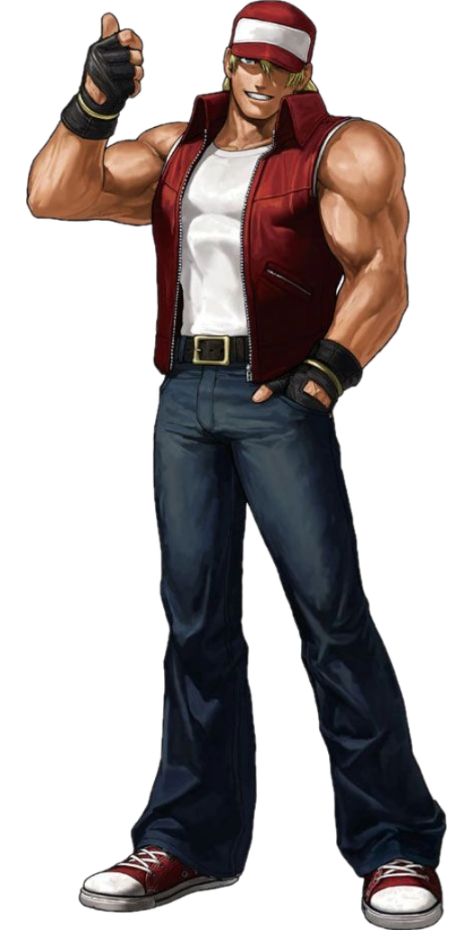 Terry a de longs cheveux blonds en queue de cheval et porte une casquette rouge et blanche avec un logo qui dit Fatal Fury. Il est vêtu d'une chemise blanche sans manches, d'un gilet rouge et d'un jean avec des baskets rouges et blanches.